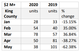 Northwest MLS statistics for King County show a correlation of declining sales in the luxury market and the impact of COVID-19: