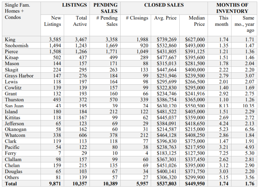 The median price on last month’s closed sales was $449,950 across the NWMLS coverage area. That compares to the year-ago figure of $440,000 an increase of about 2.3%.